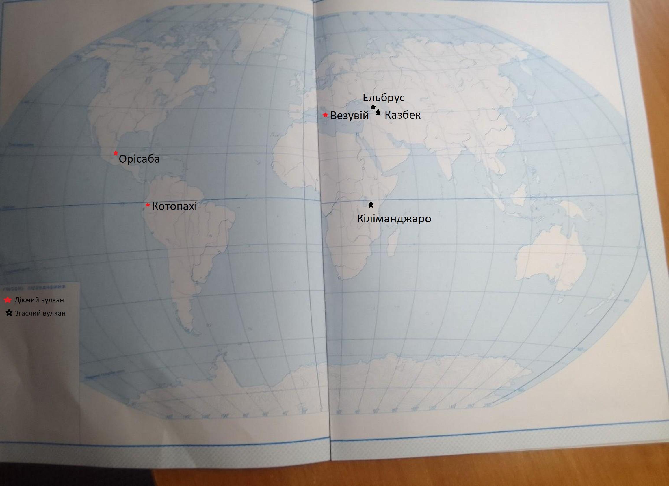 - На контурну карту ми нанесли назви вулканів (3 дієвих і 3 згаслих).