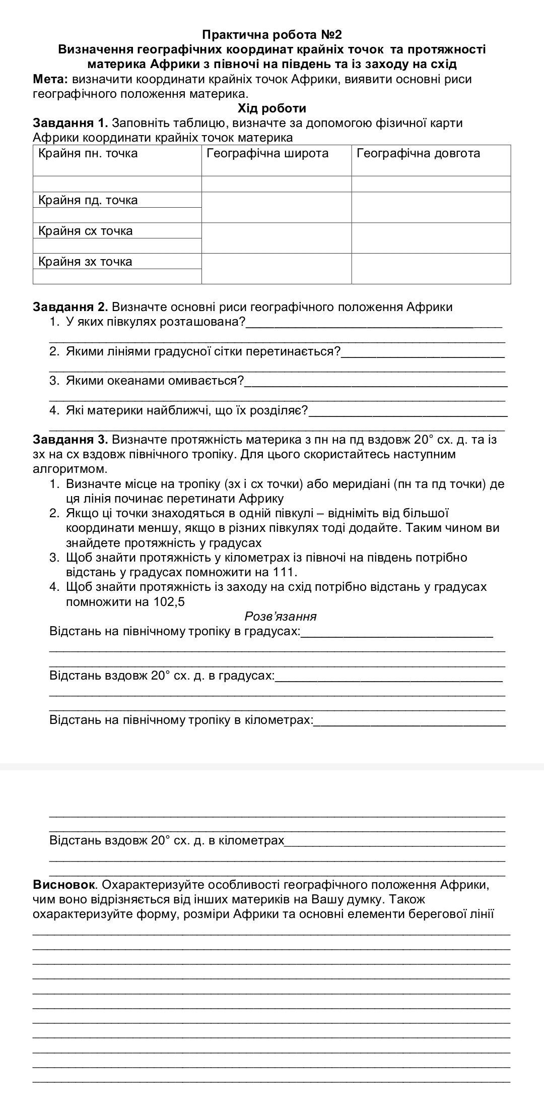 Висновок. Охарактеризуйте особливості географічного положення Африки, чим воно відрізняється від інших материків на Вашу думку. Також охарактеризуйте форму, розміри Африки та основні елементи берегової лінії