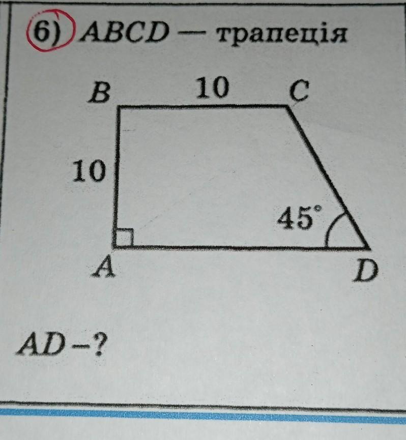 У трапеції ABCD BC║AD ; BC = AB = 10 см ; ∠D = 45° .
