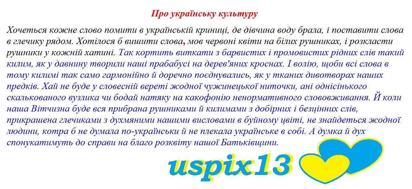 Хочеться кожне слово помити в українській криниці, де дівчина воду брала, і поставити слова в глечику рядом. Хотілося б вишити слова мов червоні квіти на білих рушниках, і розкласти рушники у кожній хатині.