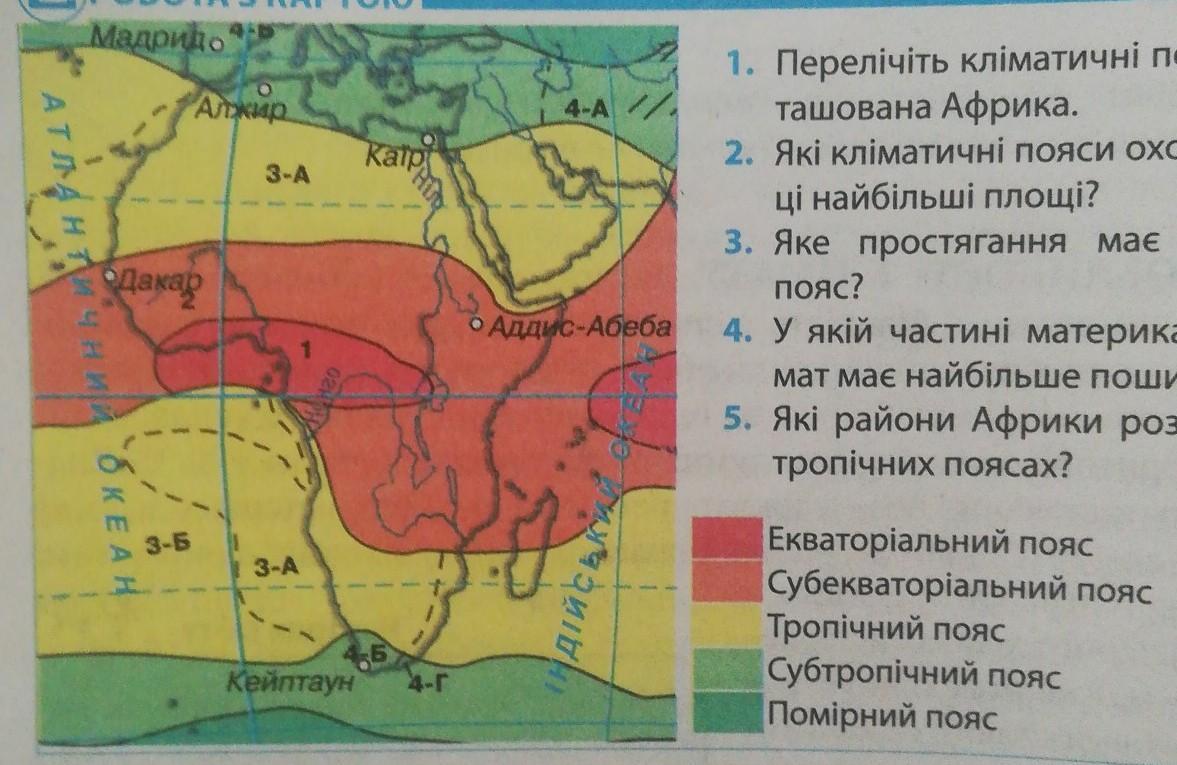 1. Перелічіть кліматичні пояси, в яких роз- ташована Африка.