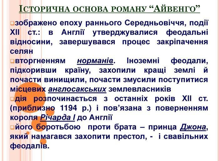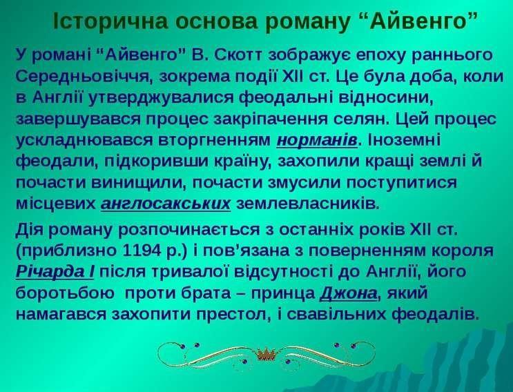 ІСТОРИЧНА ОСНОВА РОМАНУ “АЙВЕНГО” зображено епоху раннього Середньовіччя, події ХІІ ст.: в Англії утверджувалися феодальні відносини, завершувався процес закріпачення селян вторгненням норманів.