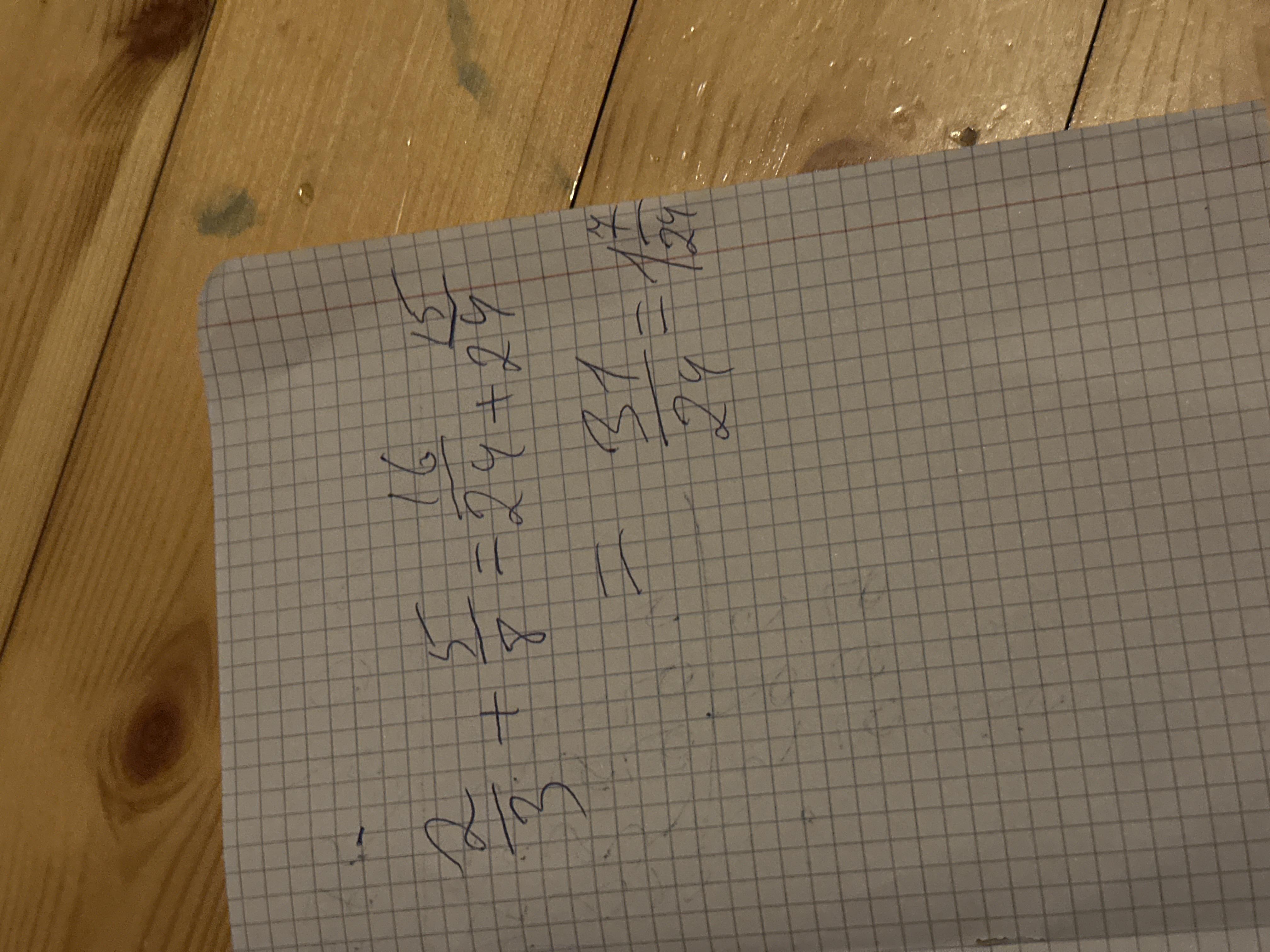 2/3 + 5/8 = (2*8)/(3*8) + (5*3)/(8*3) =