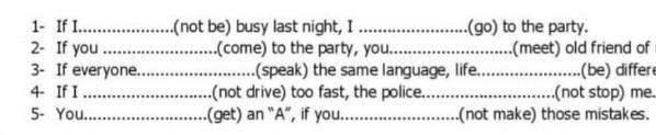 1- Якщо я....................(не буду) зайнятий минулої ночі, я............ ..(іду) на вечірку. 2- Якщо ви. ............(прийти) на вечірку, ви............................(зустрітися ) наш старий друг. 3- Якщо всі.. ...... (говорять) однією мовою, життя........................) різними 4- Якщо я. ...(не їздити) занадто швидко, поліція....... ....(не зупинити) мене. 5- Ви ... (отримаєте) "А", якщо ви................ ...(не робите) цих помилок.