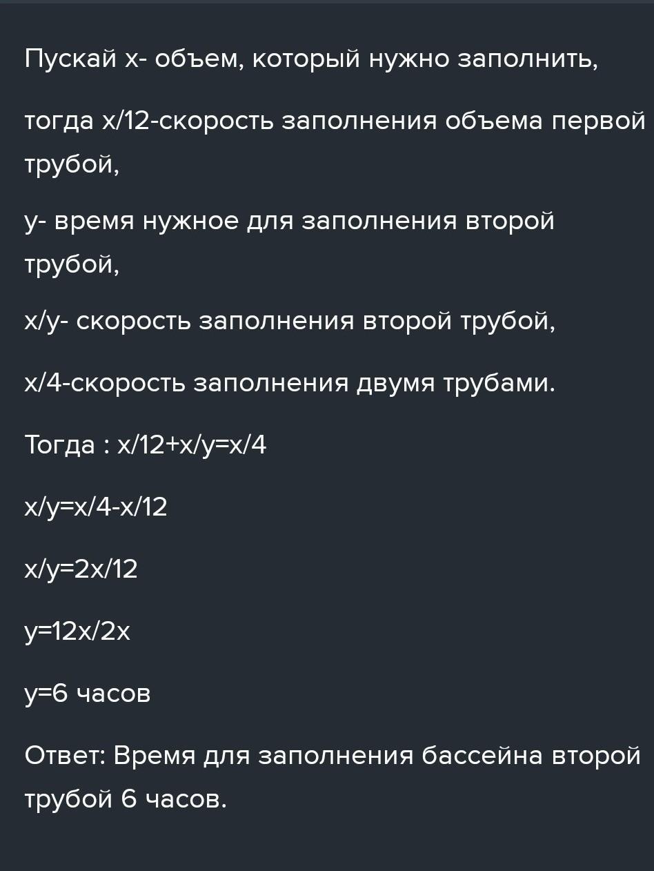 через дві труби бассейн можна наповнити за 4години яка частина басейну наповниться за 1годину якщо через другу трубу то басейн можна заповнити за 6годин?