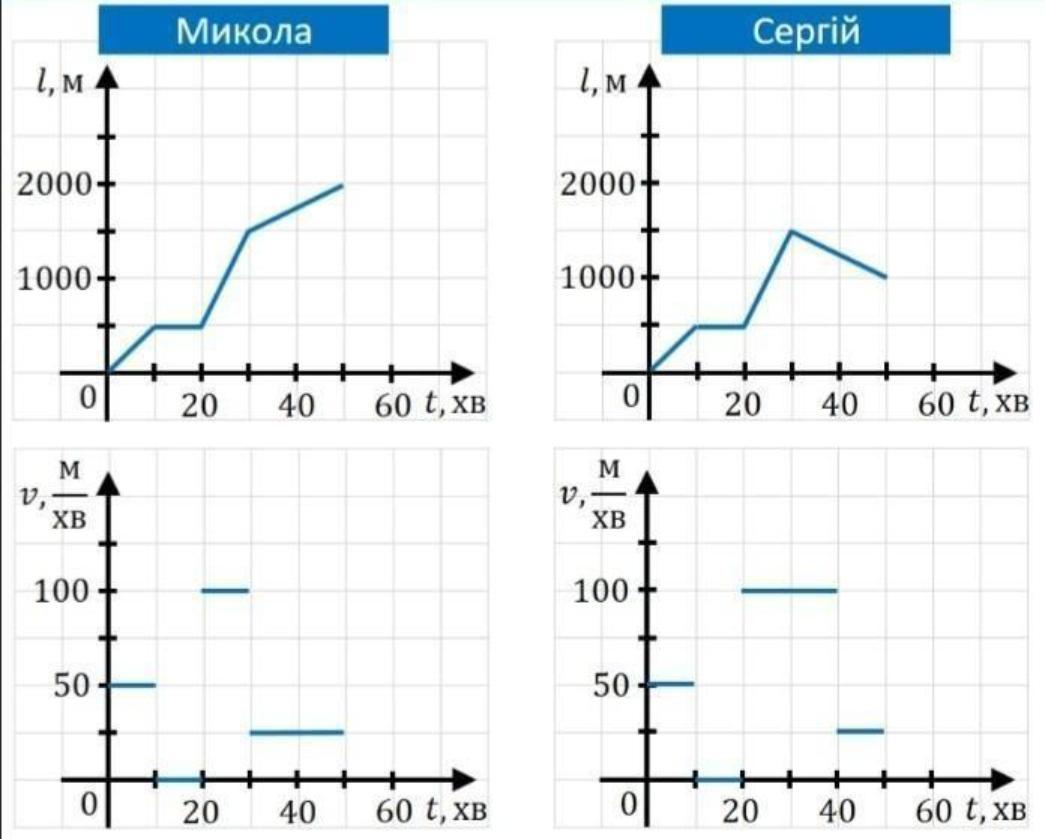 Рухаючись разом з міста до селища два однокласники Сергій і Микола досліджували залежність пройденого шляху від часу, швидкості від часу на різних ділянках своєї подорожі. Обидва побудували графіки залежності шляху від часу та швидкості від часу. Відомо, що на першій ділянці руху хлопці протягом 10 хв пройшли 500 м, на другій - зробили зупинку на 10 хв, на третій – бігли із швидкістю у двічі більшою за швидкість на першій ділянці протягом 10 хвилин, і, нарешті, пройшли ще 500 м, витративши на всю дорогу 50 хв. Хто з хлопців виконав графіки із помилками, і які саме ці помилки?
