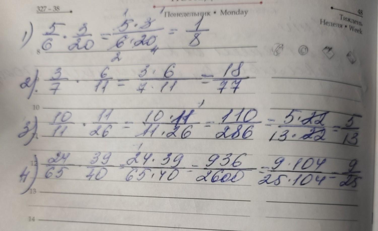 4) (24/65) * (39/40) = 936/2600 = 117/325