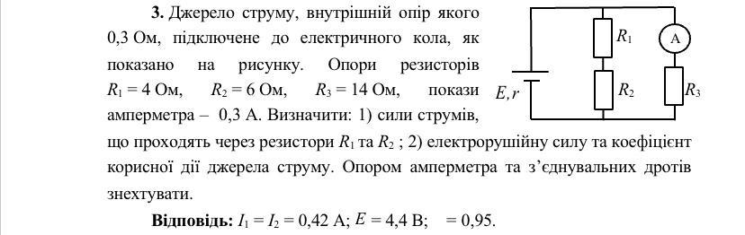 Джерело струму, внутрішній опір якого 0,3 Ом, підключене до електричного кола, як показано на рисунку. Опори резисторів R1 = 4 Ом, R2 = 6 Ом, R3 = 14 Ом, покази амперметра – 0,3 А. Визначити: 1) сили струмів, що проходять через резистори R1 та R2 ; 2) електрорушійну силу та коефіцієнт корисної дії джерела струму. Опором амперметра та з’єднувальних дротів знехтувати.