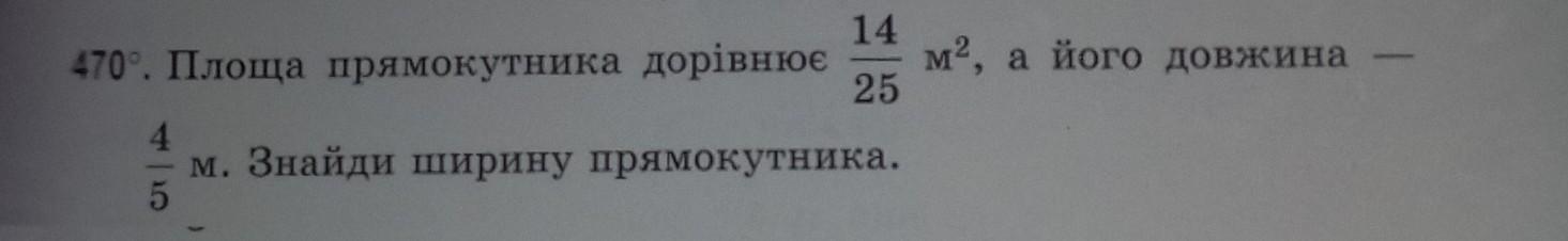 Площа прямокутника дорівнює 14/25 , а його довжина --- 4/5 м. знайди ширину прямокутника.