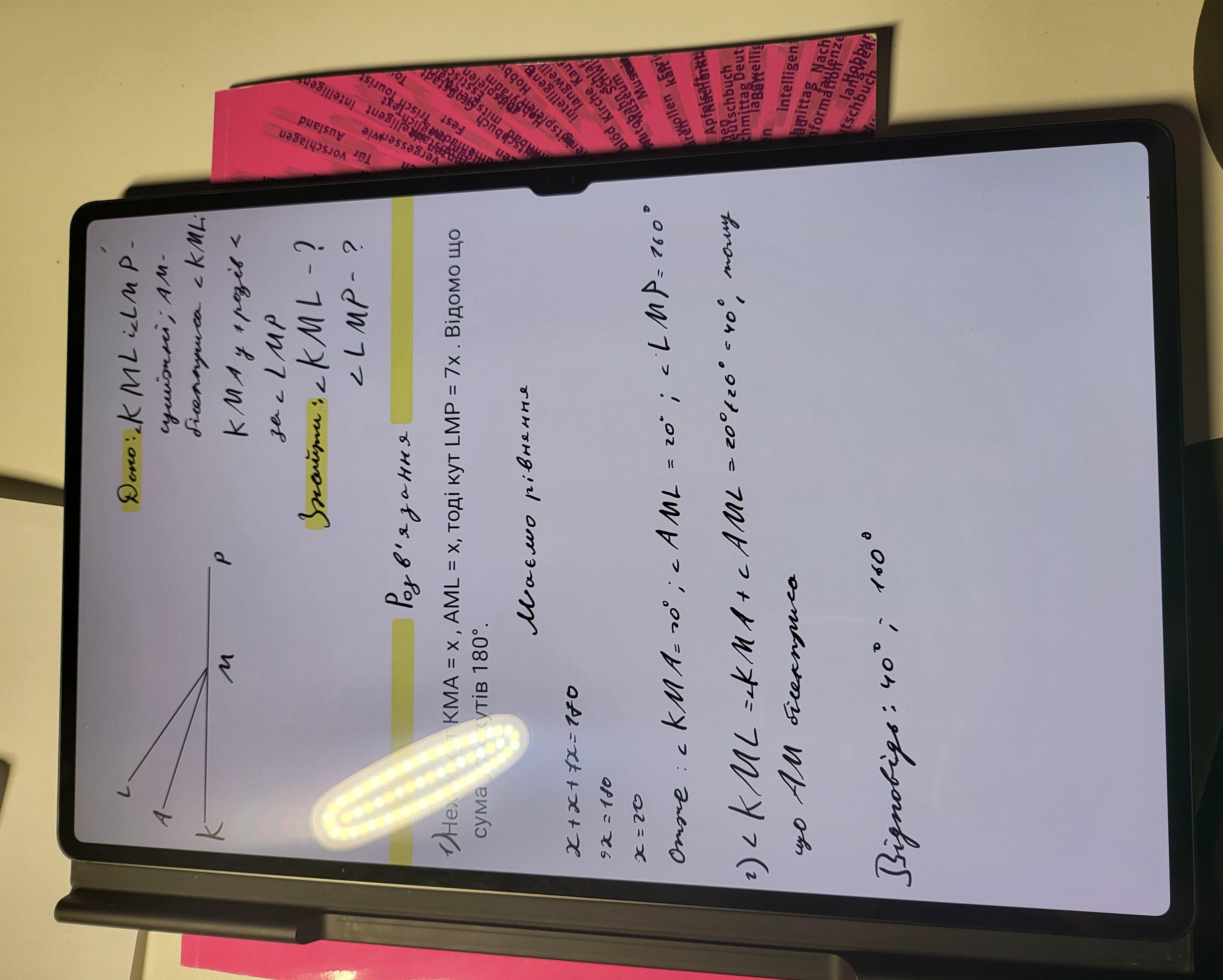 KML i LMP- суміжні, промінь МА- бісектриса кута KML. Кут КМА у 7 разів менший за кут LMP. Знайдіть KML i LMP