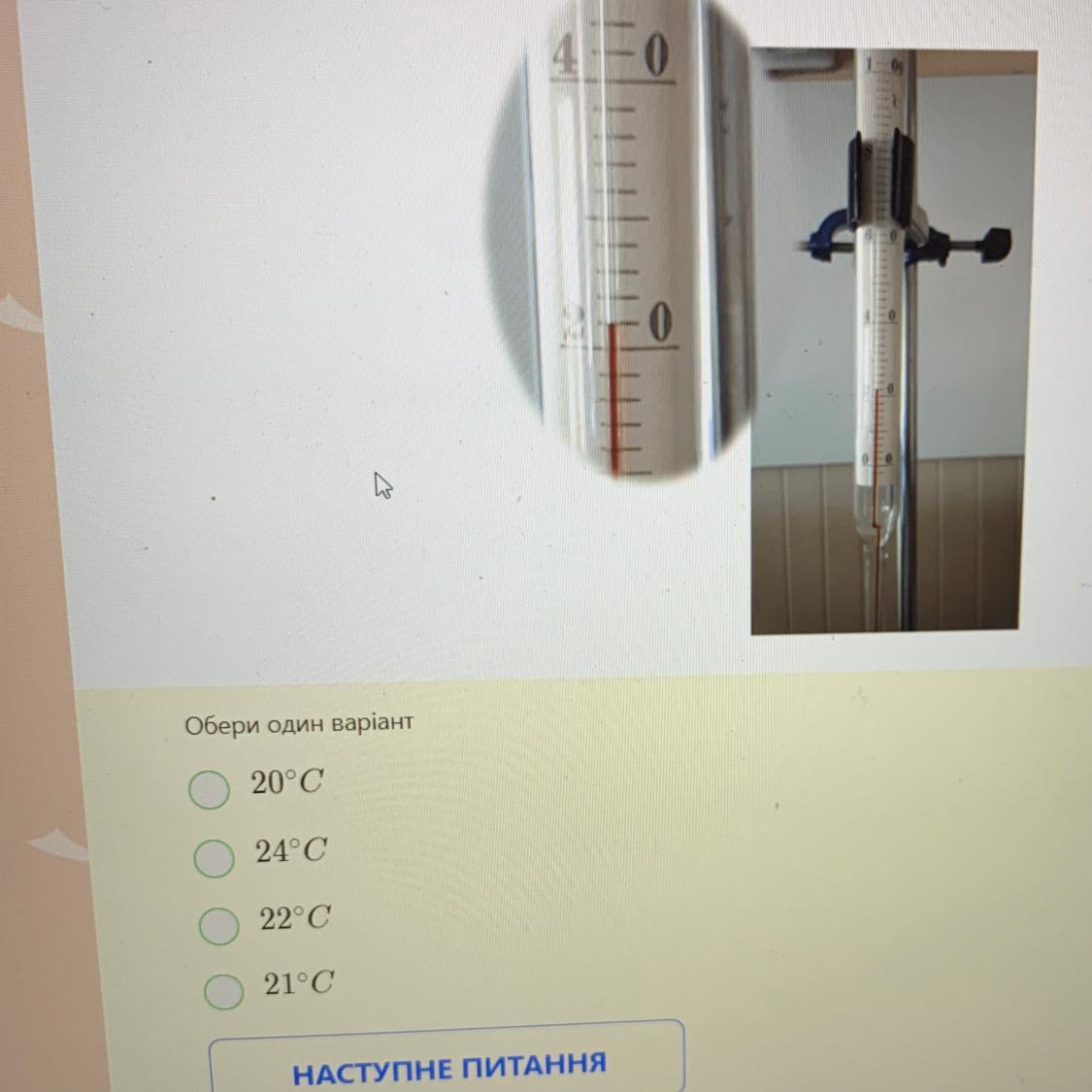 Для початку визначимо ціну однієї поділки. З фото ми бачимо, що ціна однієї поділки 1°. Тоді ми дивимось, що показник термометра піднявся на одну поділку вищу ніж 20°, тому 20°+1°=21°. Відповідь 21