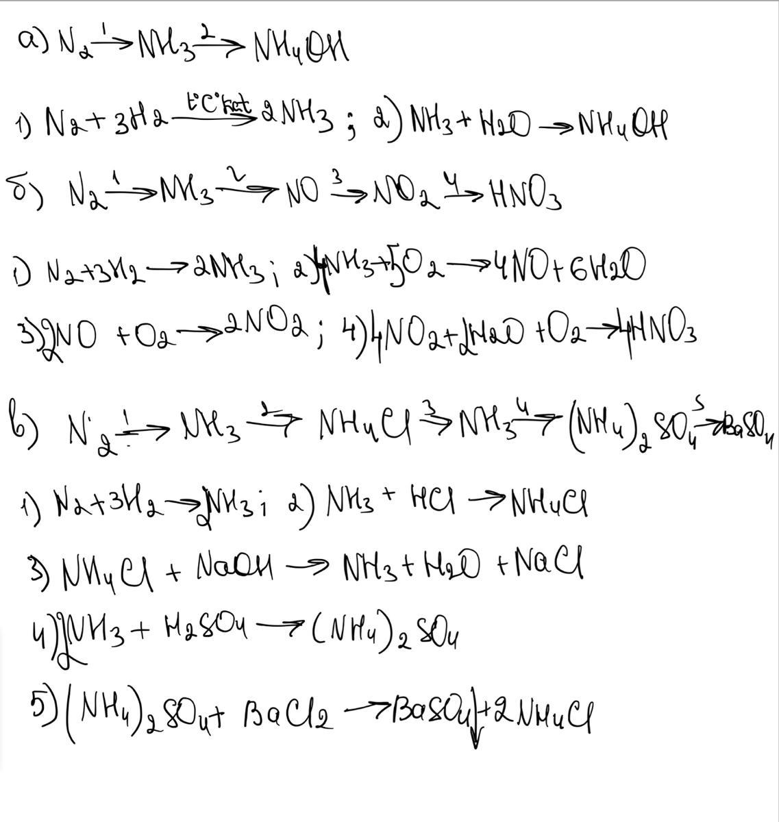 б) N2 → NH3 → NO → NO2 → HNO3.