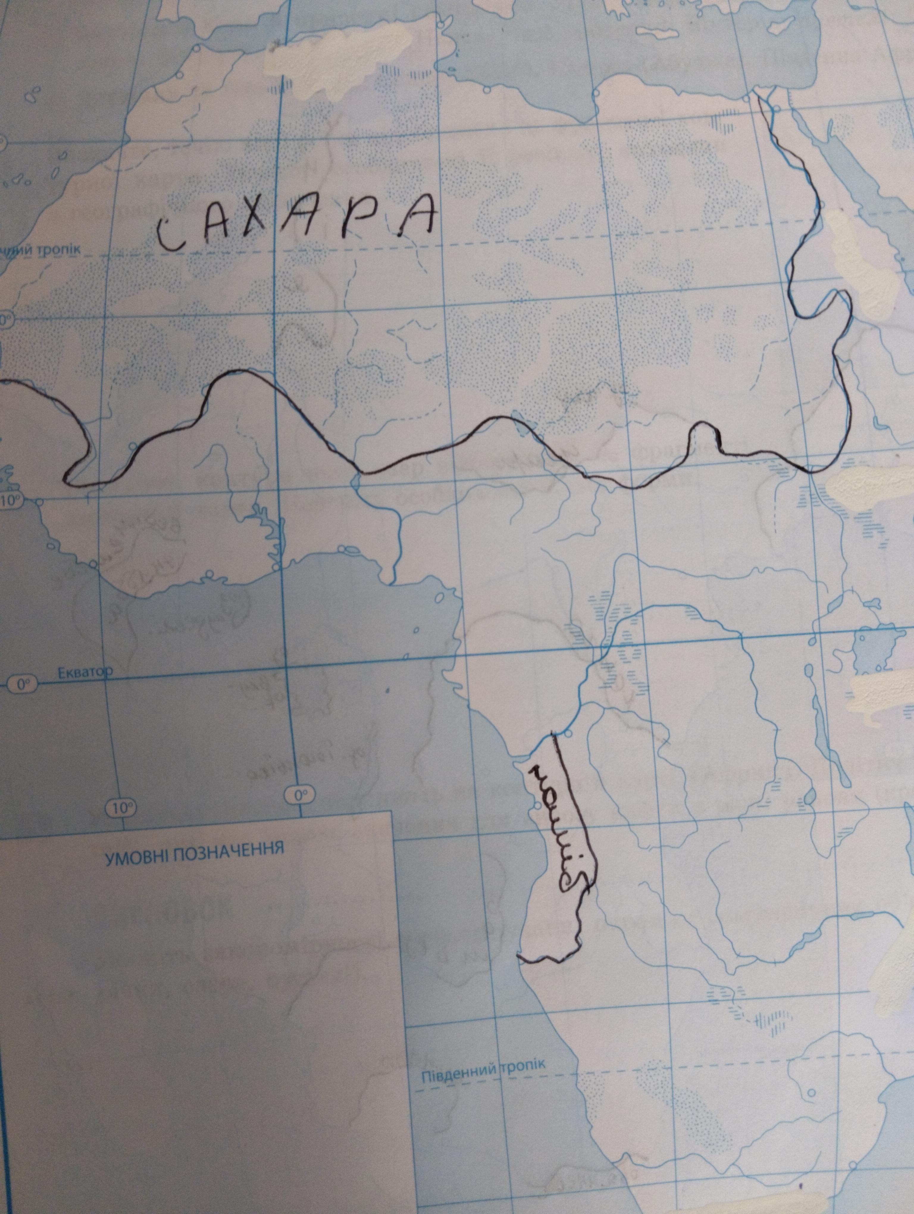 Позначте на контурній карті географічні об'єкти: пустелі: Сахара, Наміб.