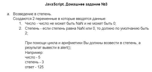 JavaScript. Домашнее задание №3 а. Возведение в степень. Создаются 2 переменные в которые вводятся данные: 1. Число число не может быть NaN и не может быть 0; - 2. Степень - если степень равна NaN или 0, то должно по умолчанию быть 2; При помощи цикла и арифметики Вы должны возвести в степень, а результат вывести в alert(); Например: число - 5 степень - 3 ответ - 125 помогите пожалуйста дам 50 баллов