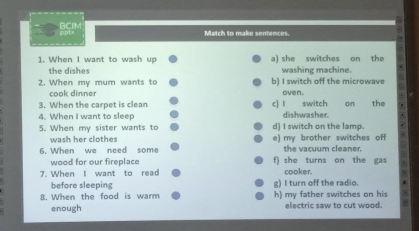 BCIM pptx 1. When I want to wash up the dishes 2. When my mum wants to cook dinner 3. When the carpet is clean 4. When I want to sleep 5. When my sister wants to wash her clothes 6. When we need some wood for our fireplace 7. When I want to read before sleeping 8. When the food is warm enough Match to make sentences. a) she switches on the washing machine. ●b) I switch off the microwave oven. c) I switch on the dishwasher. d) I switch on the lamp. e) my brother switches off the vacuum cleaner. f) she turns on the gas cooker. g) I turn off the radio. h) my father switches on his electric saw to cut wood.
