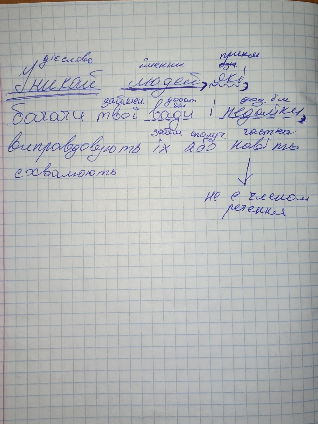 7. Зробити синтаксичний розбір речення (підкреслити члени речення, розставити розділові знаки, над кожним словом надписати частину мови) - 6 балів: Уникай людей які бачачи твої вади і недоліки виправдовують їх або навіть схвалюют.