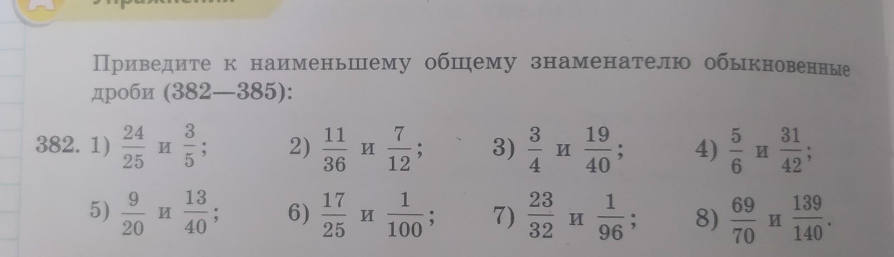 1) общий знам - 25 (2 дробь домножить на 5) 2) 36 (2 др домножить на 3) 3)40 (1 др домножить на 10) 4)42 (1 домножить на 7) 5)40 (1 домножить на 2) 6)100 (1 домножить на 4) 7)96 (1 домножить на 3) 8)140 (1 домножить на 2)
