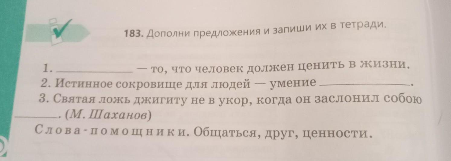 183. ДОПОЛни предложения и запиши их в тетради. то, что человек должен ценить в жизни, 1. 2. Истинное сокровище для людей 3. Святая ложь Джигиту не в укор, когда он заслонил собою (М. Шаханов) Слова-помощник и. Общаться, друг, ценности. - Пусть добрым будет ум у вас, а сердце умным будет. С.Я. Маршак