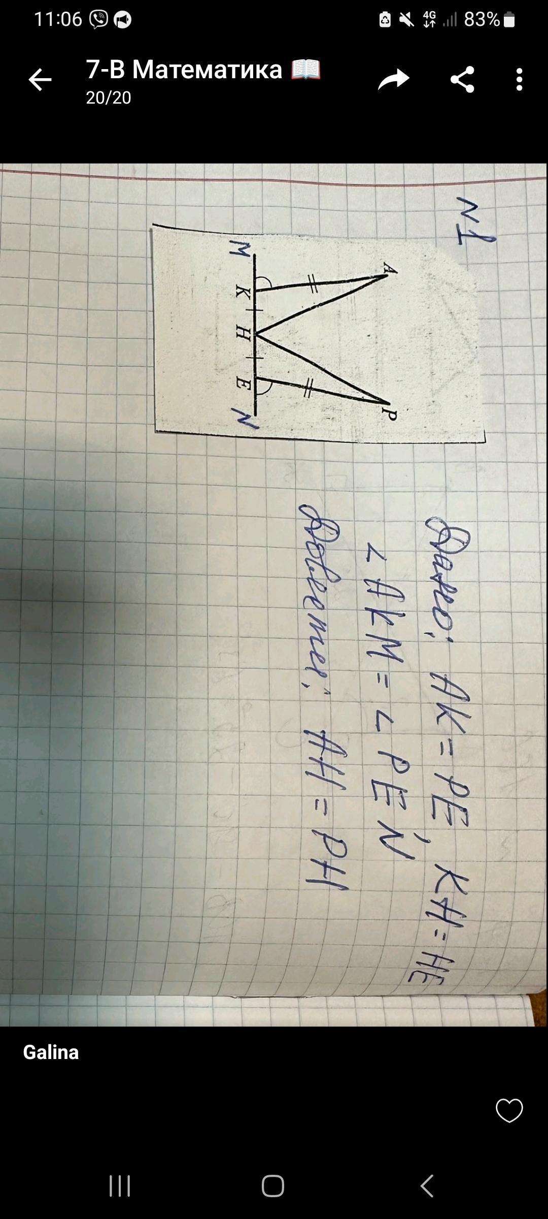 Они равны по следующей теореме:если две стороны и угол между ними у одного треугольника соответственно равны двум сторонам и углу, заключённому между ними, у другого треугольника, то такие треугольники равны. В данном случае:так как между AK и KH угол AKM, а между PE и EH угол PEN, и все они между собой соответственно равны, то треугольники равны, а значит и их третьи стороны - AH и PH - тоже равны