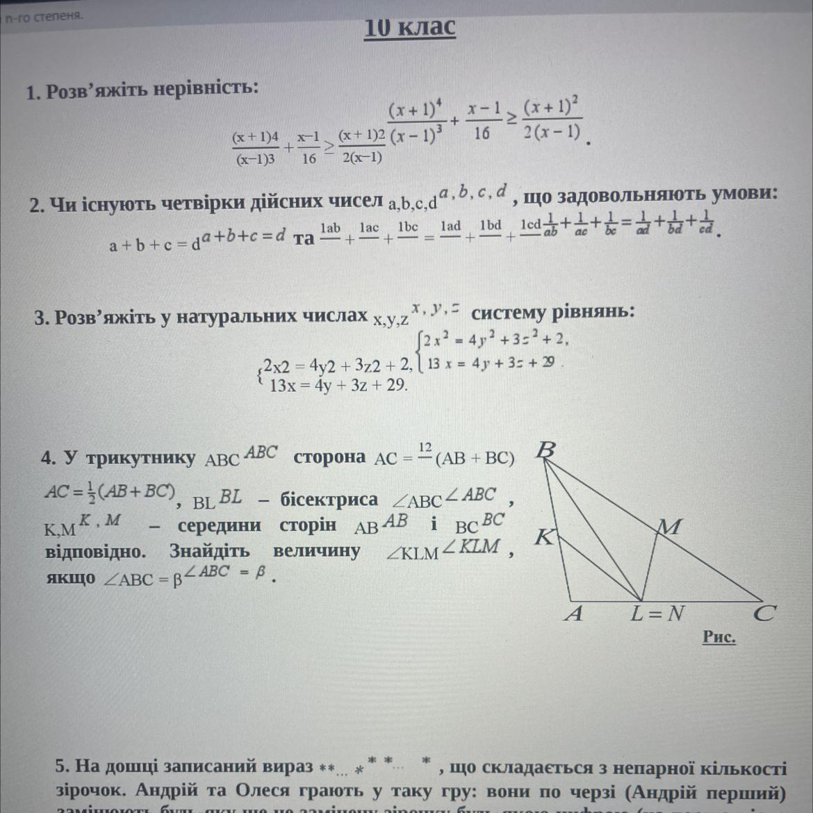 У трикутнику ABC, сторона AS = 1/2 (AB + BC), і BL є бісектрисою кута ABC. К і М є серединами сторін AB і BC відповідно. Ми хочемо знайти величину кута КLM, якщо кут АВС = В.
