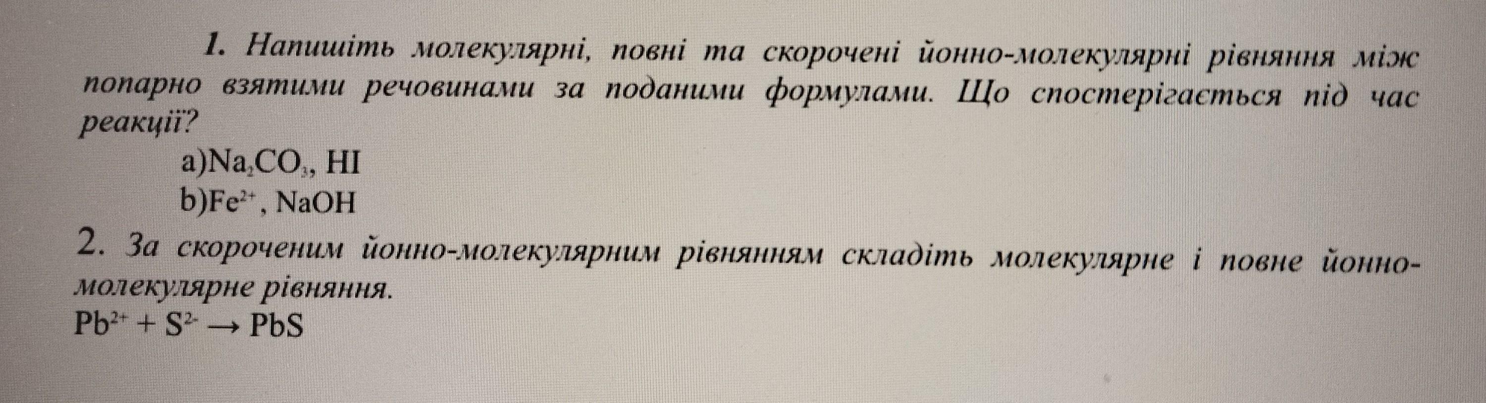 1. Напишіть молекулярні, повні та скорочені йонно-молекулярнi рiвняння між попарно взятими речовинами за поданими формулами. Що спостерігається під час реакції? a)Na2CO3, HI b)Fe2+, NaOH 2. За скороченим йонно-молекулярним рiвнянням складіть молекулярне і повне йонно- молекулярне рiвняння. Pb2+ + S²- > PbS