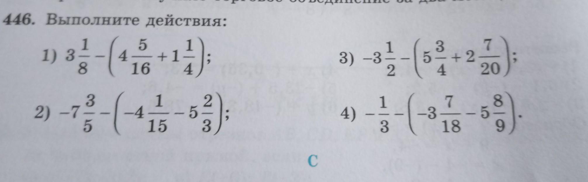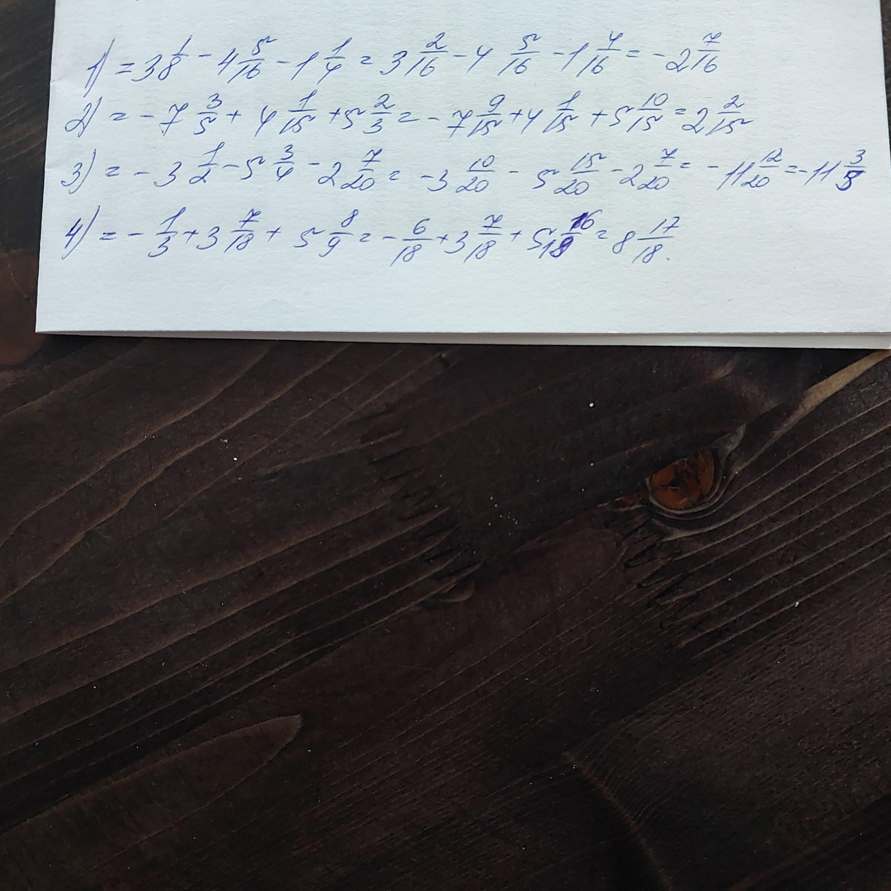 Выполните действия: 1)2 1/8-(4 5/16+1 1/4) 2)-7 3/5-(-4 1/15 -6 2/3 3)-3 1/2-(5 3/4+2 7/20) 4)-1/3-(-3 7/18-5 8/9