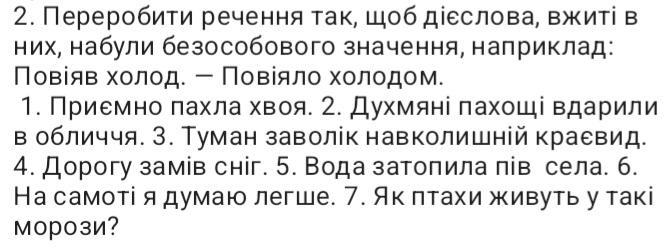 Ось варіанти переробки речень:Приємно пахла хвоя. - Хвоя пахла приємно.Духмяні пахощі вдарили в обличчя. - В обличчя вдарили духмяні пахощі.Туман заволік навколишній краєвид. - Навколишній краєвид заволокло туманом.Дорогу замів сніг. - Сніг замело дорогу.Вода затопила пів села. - Пів села затопила вода.На самоті я думаю легше. - Мені легше думати на самоті.Як птахи живуть у такі морози? - Як птахам жити у такі морози?У цих реченнях дієслова, які вжиті в особовій формі, були перероблені в безособову форму за допомогою наступних прийомів:Заміни підмета на обставину місця, часу або причини.Заміни дієслівних форм на іменні форми (іменники, прикметники, дієприкметники).Добавте до дієслова прийменник.Так, у першому реченні підмет "хвоя" був замінений на обставину місця "в хвоя". У другому реченні дієслово "вдарили" було замінено на іменник "пахощі", а обставина місця "в обличчя" була перенесена на початок речення. У третьому реченні дієслово "заволік" було замінено на іменник "туман", а обставина місця "навколишній краєвид" була перенесена на початок речення. У четвертому реченні дієслово "замів" було замінено на іменник "сніг", а обставина місця "дорогу" була перенесена на початок речення. У п'ятому реченні дієслово "затопило" було замінено на іменник "вода", а обставина місця "пів села" була перенесена на початок речення. У шостому реченні дієслово "думаю" було замінено на прикметник "легкий", а обставина місця "на самоті" була перенесена на початок речення. У сьомому реченні дієслово "живуть" було замінено на іменник "птахи", а обставина часу "у такі морози" була перенесена на початок речення.
