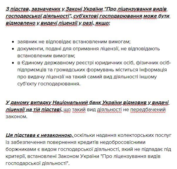 Національний банк України відмовив у видачі ліцензії на тій підставі, що такий вид діяльності не передбачений законом і заявник подав неправдиві відомості про свого керівника.