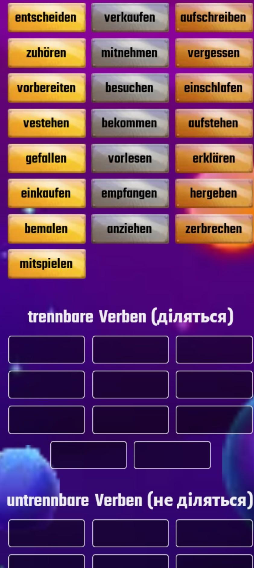 діляться: aufschreiben, zuhören, mitnehmen, einschlafen, aufstehen, einkaufen, anziehen, hergeben, mitspielen, vorlesen, zerbrechen.