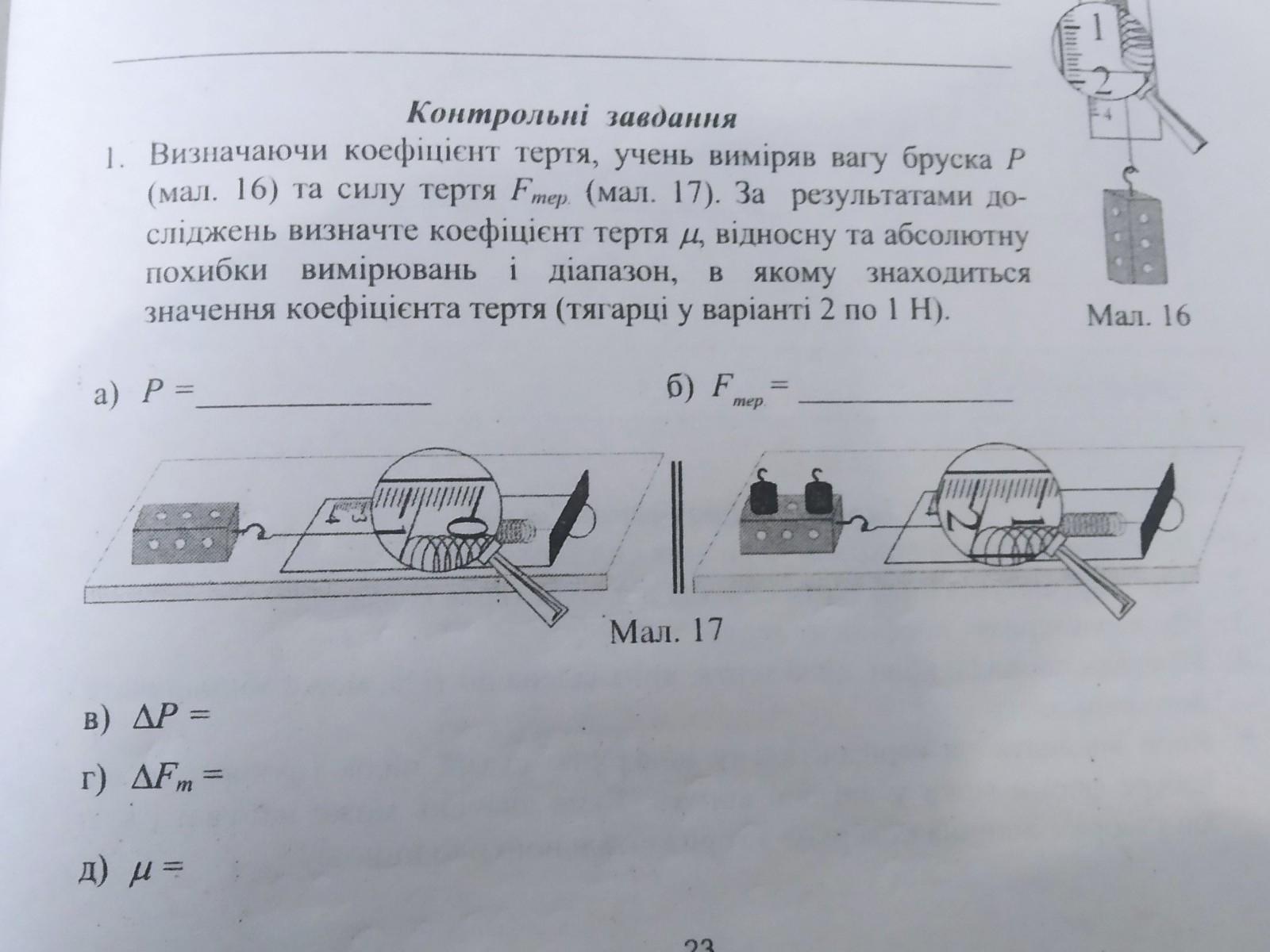 Контрольні завдання Визначаючи коефіцієнт тертя, учень виміряв вагу бруска р (мал. 16) та силу тертя F (мал. 17). За результатами до- сліджень визначте коефіцієнт тертя д відносну та абсолютну похибки вимірювань і діапазон, в якому знаходиться значення коефіцієнта тертя (тягарці у варіанті 2 по 1 Н)