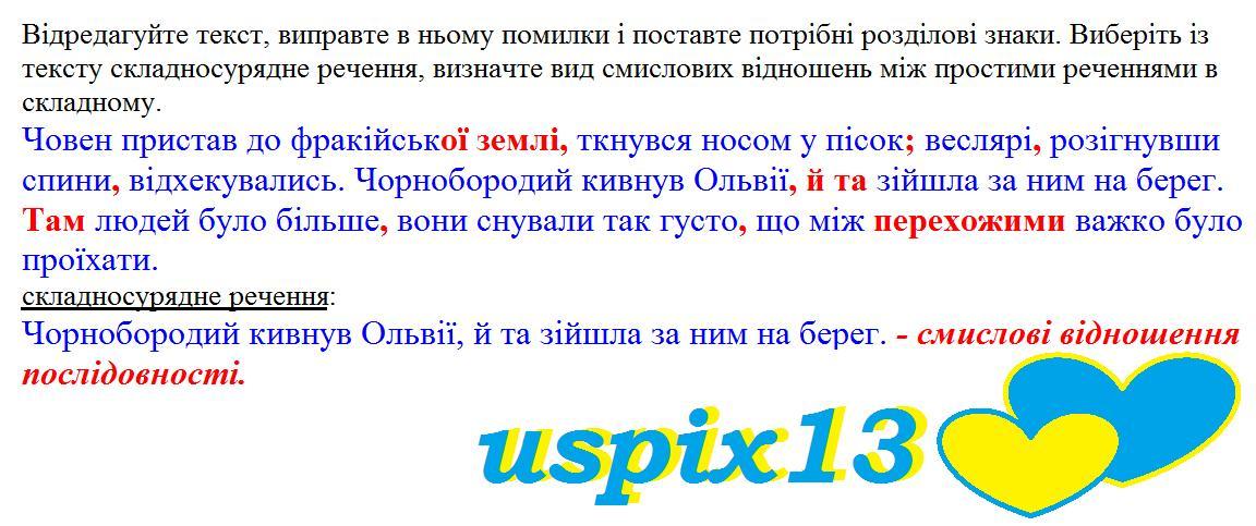 Відредагуйте текст, виправте в ньому помилки і поставте потрібні розділові знаки. Виберіть із тексту складносурядне речення, вид смислових відношень між простими реченнями в складному. Визначте Човен пристав до фракійського берега ткнувся носом у пісок веслярі розігнувши спини відхекувались. Чорнобородий кивнув Ольвії і вона зійшла за ним на берег. На фракійському березі людей було більше вони снували так густо що між ними важко було проїхати.
