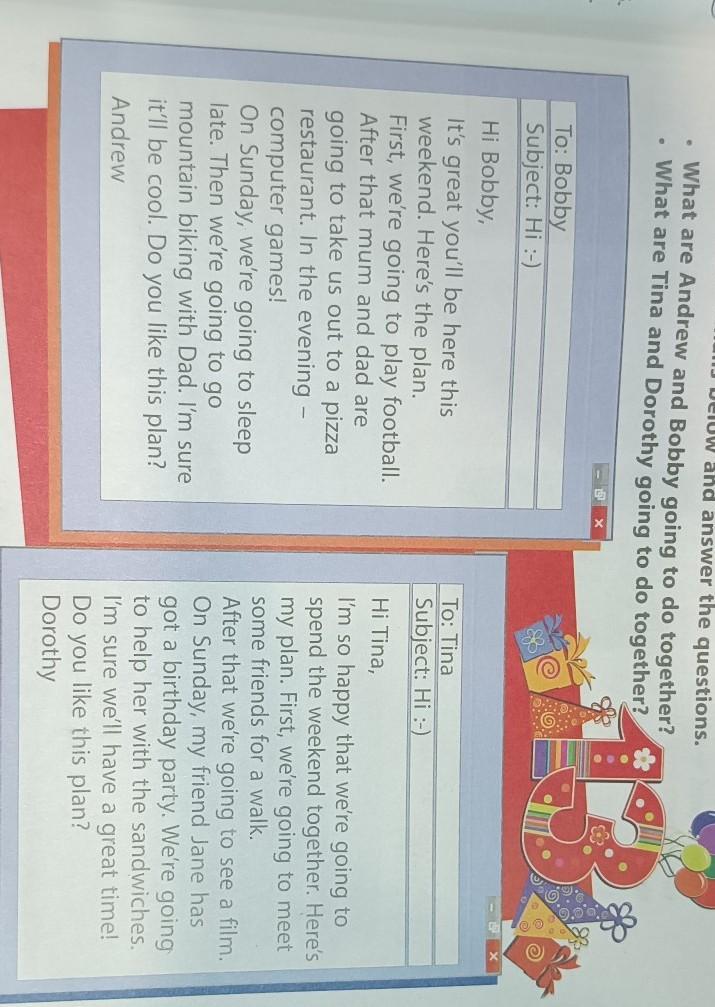 1.Andrew and Bobby will spend time together on Saturday by meeting some friends for a walk and watching a film. On Sunday, they'll help their friend Jane with the sandwiches at her birthday party.