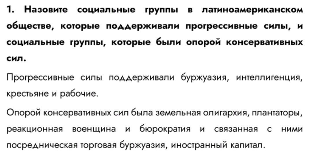 Назовите социальные группы в латиноамериканском обществе, которые поддерживали прогрессивные силы, и социальные группы, которые были опорой консервативных сил.