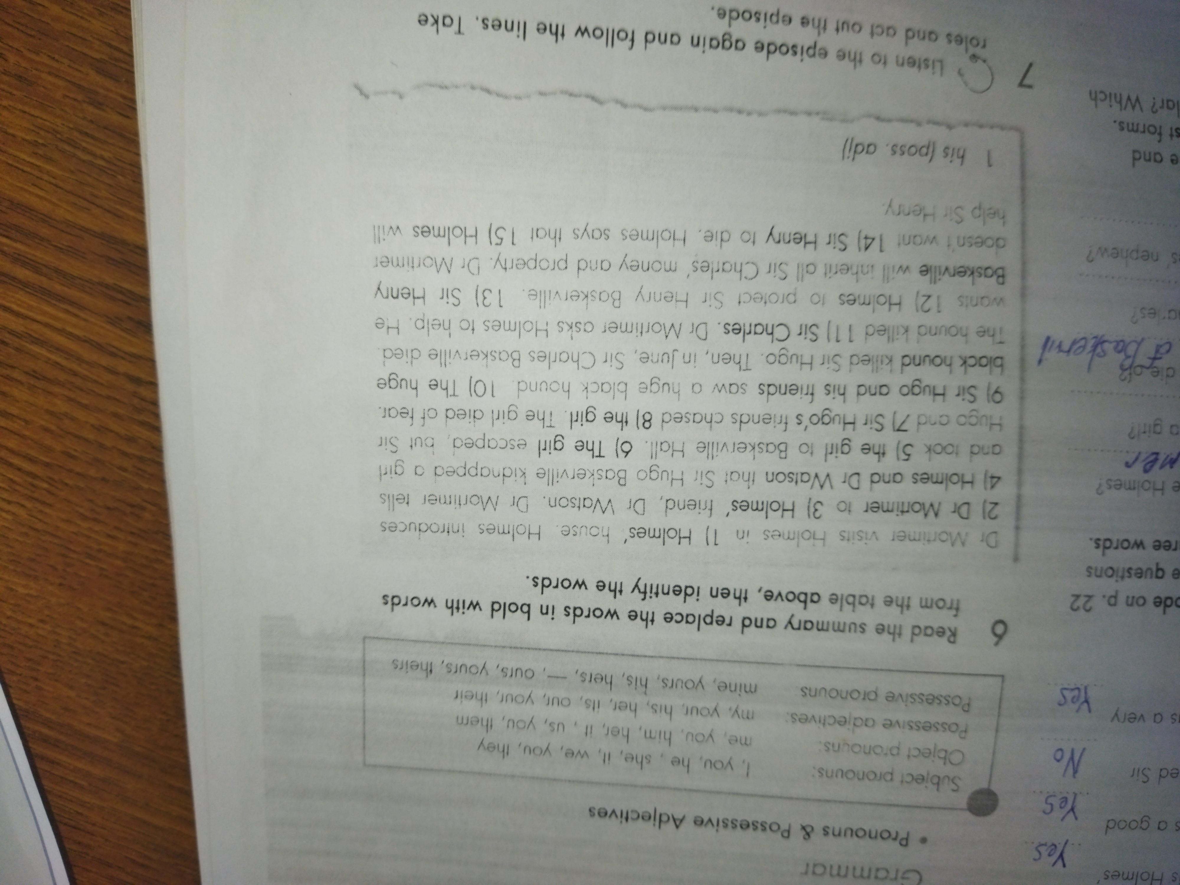 Dr. Mortimer visits Holms in his house. Holmes introduces him to his friend, Dr. Watson. Dr. Mortimer tells them that Sir Hugo Baskerville kidnapped a girl and took her to Baskerville Hall. She escaped, but Sir Hugo and his friends chased her. 9)They 10) He 11) Him 12) Him 13) He 14) Him 15) He