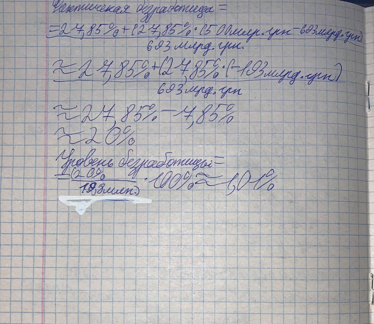Численность населения страны составляет 36 млн человек. Доля рабочей силы в популяции равна 55 %. Один занят создает за год продукции на 35 тыс. грн. Фактический ВВП в стране составляет 500 млрд. грн. Естественная норма безработицы – 7 %. Определите уровень безработицы.
