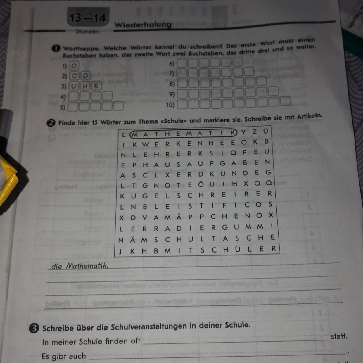 Das Werk, der Lehrer, die Hausaufgaben, die Kunde, die Note, der Kugelschreiber, der Bleistift, das Mäppchen, der/das Radiergummi, die Schultasche, der Mitschüler, das Lineal, die Stunde.