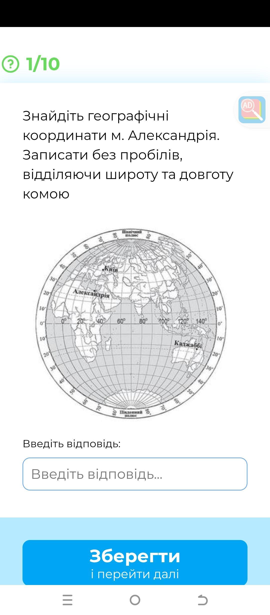 Знайдіть географічні координати М. Олександрія записати без пробілів видаляючи широта та довжину комою