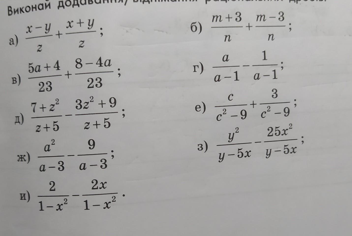 Виконай додавання/віднімання раціональних дробів. m +3 m-3 + ; a) B) Д) ж) и) x-y+x+y; 2 2 5а+4 8-4a 23 23 7+z² 3z²+9 2+5 +- 2+5 a2 а-3 2 2x 1 - x² 1 - x2 9 а-3 ; ; ; б) г) e) 3) n a a-1 n c2 1 a-1 C 3 + -9 c²-9 y² y-5x ; 25x2 y-5x ;помогите срочно надо дам 100 балов