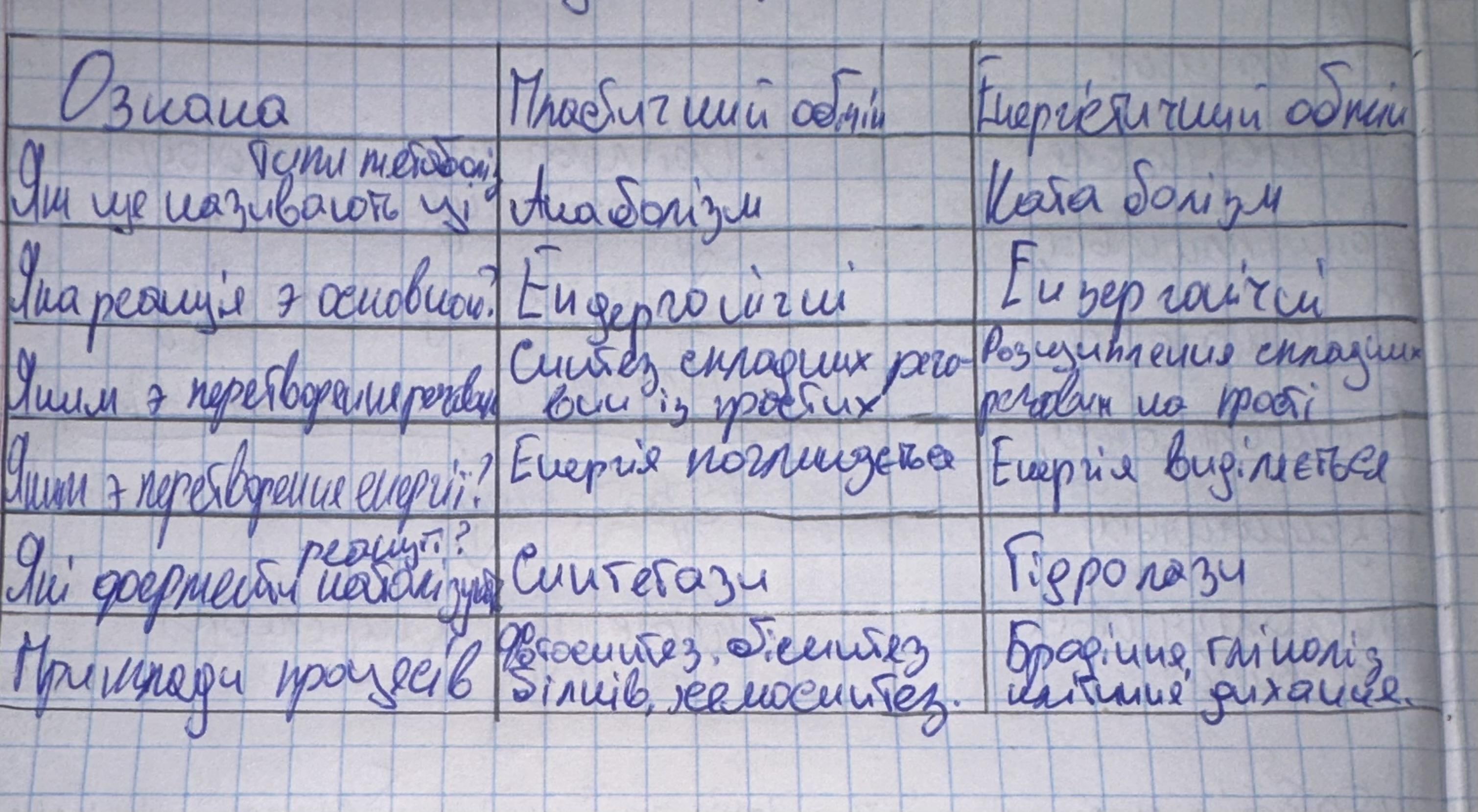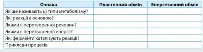 Ознака Як ще називають ці типи метаболізму? Які реакції є основою? Якими є перетворення речовин? Якими є перетворення енергії? Які ферменти каталізують реакції? Приклади процесів