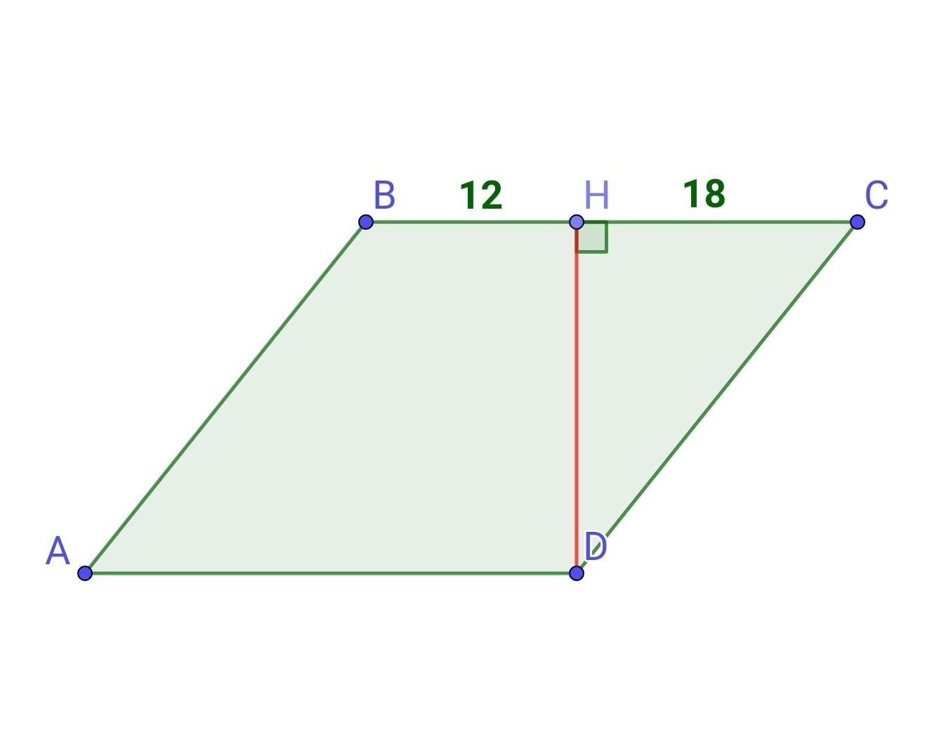 Дано ромб ABCD у якому з вершини кута D до сторони BC проведеноперпендикуляр DH. BH=12см. HC=18 см. Визнач довжину перпендикуляра DH. Обчисли площу ромбо ABCD.