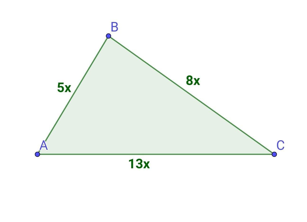 Нехай АВС - даний трикутник. Позначимо AВ=5x, BC=8x, AC=13x, де х - коефіцієнт пропорційності.