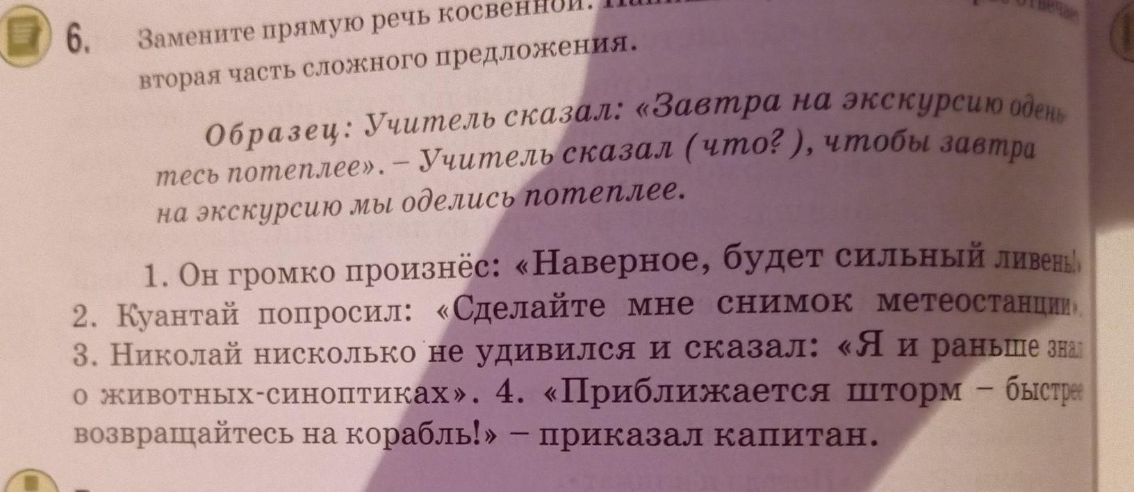 6. Замените прямую речь косвенной. Напишите, на какой вопрос отвечает вторая часть сложного предложения. Образец: Учитель сказал: «Завтра на экскурсию одень- тесь потеплее». – Учитель сказал (что? ), чтобы завтра на экскурсию мы оделись потеплее. 1. Он громко произнёс: «Наверное, будет сильный ливень!» 2. Куантай попросил: «Сделайте мне снимок метеостанции». 3. Николай нисколько не удивился и сказал: «Я и раньше знал о животных-синоптиках». 4. «Приближается шторм возвращайтесь на корабль!>> - приказал капитан - быстрее -.