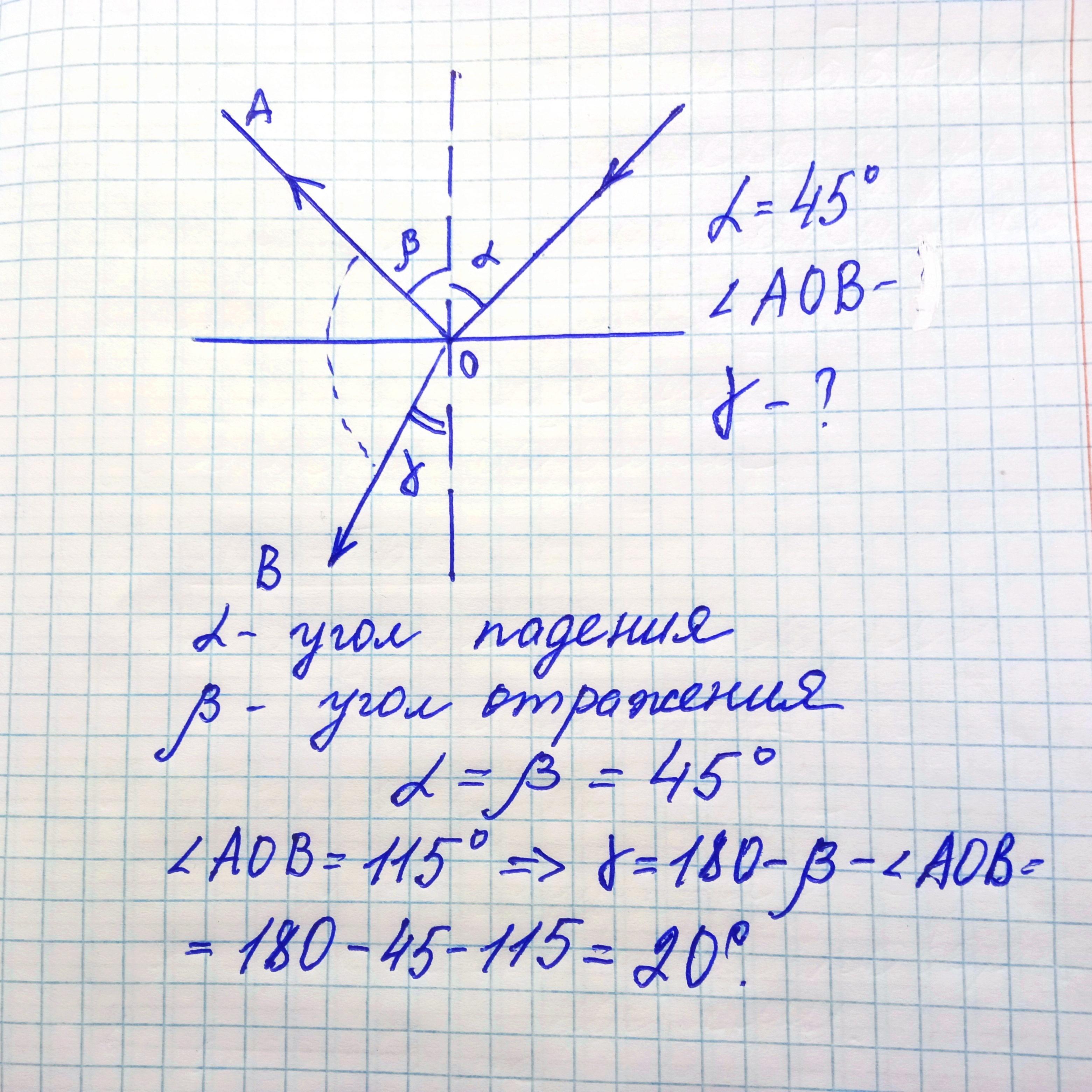 Воспользовавшись рисунком 1, определите угол преломления, если известно, что угол отражения составляет 45°, а угол между отраженным и преломленным лучами 115°.