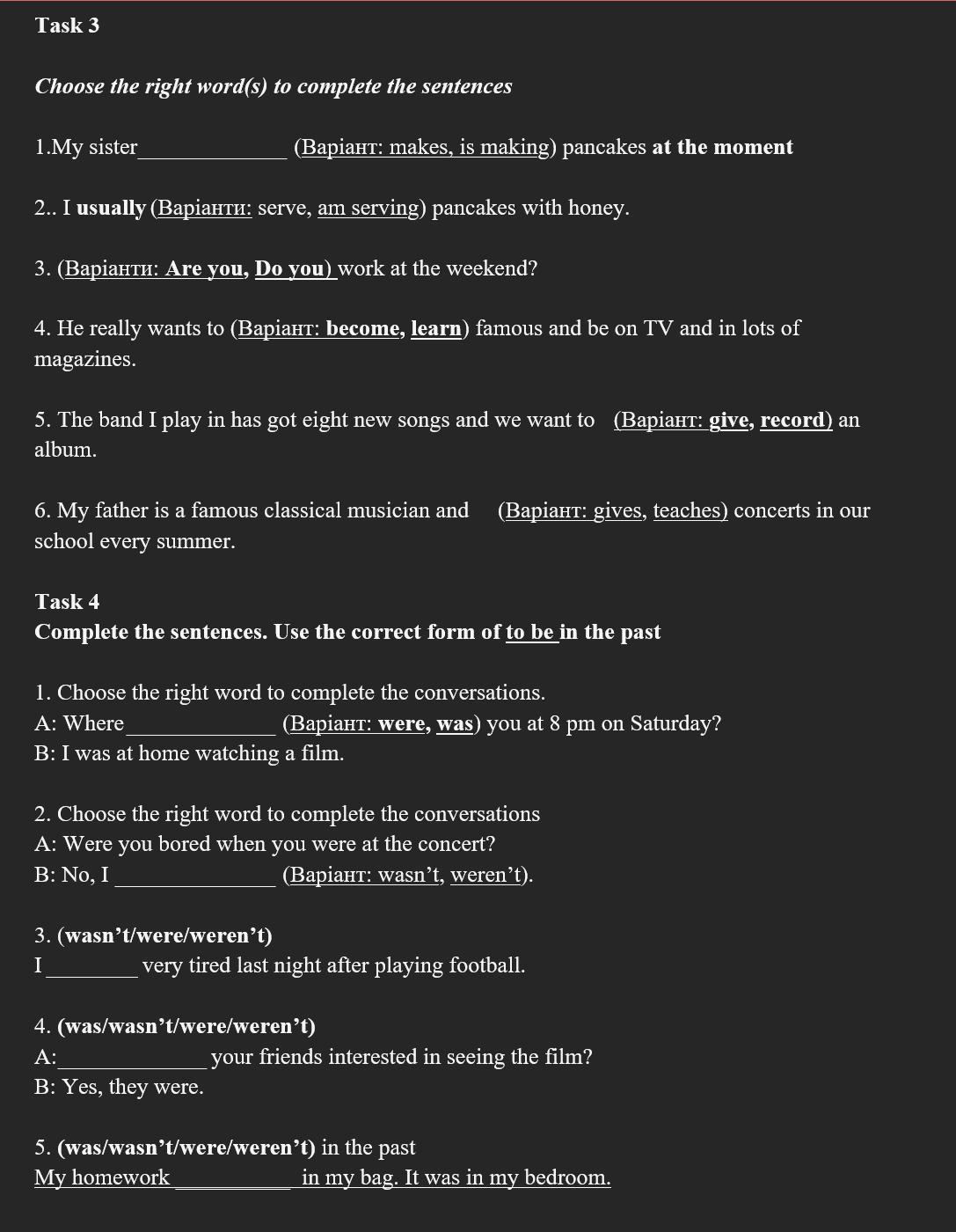 Task 3. 1. is making 2. serve 3. Do you work at the weekend? 4. become 5. record 6. gives