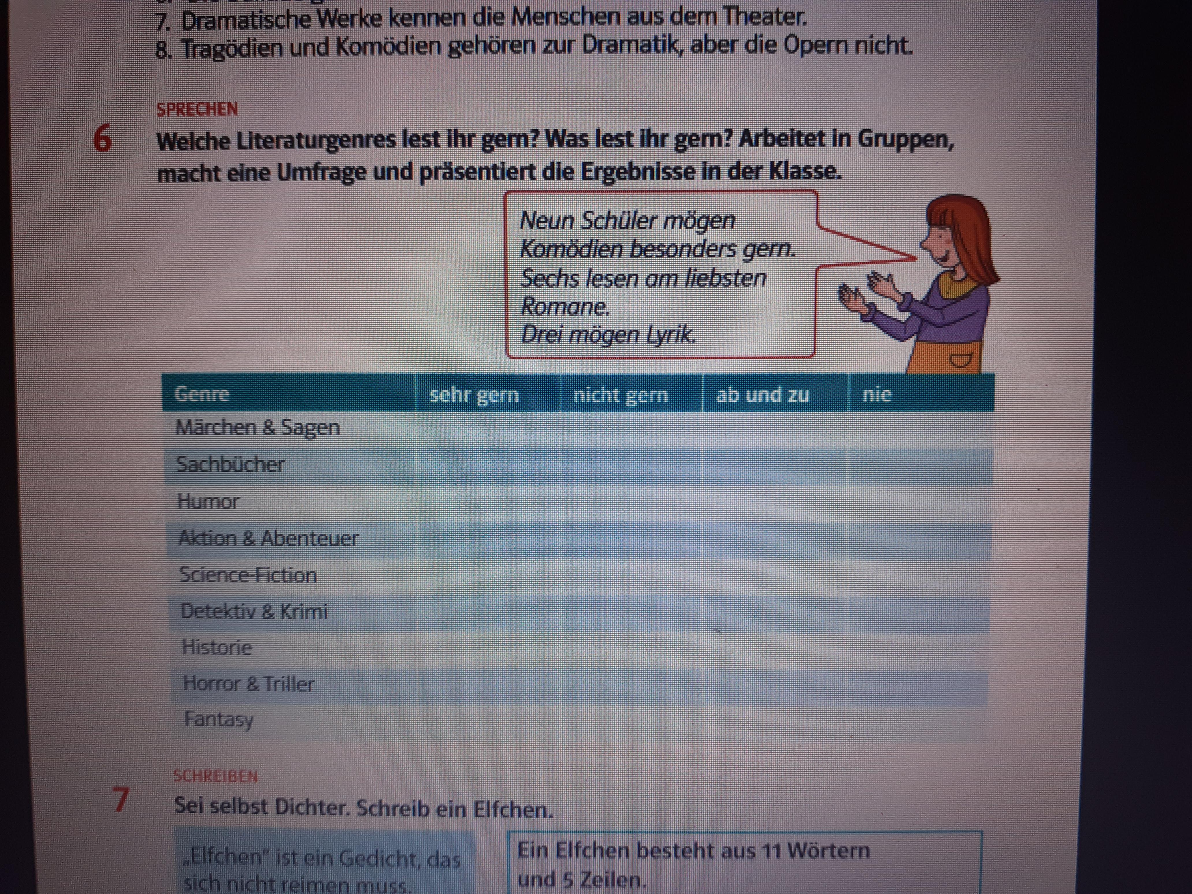 это задание которое нужно выполнить в группе. в таблице есть названия разных литературных жанров: сказки и легенды, научно популярные книги, юмор, экшн и приключения, научная фантастика, детектив и криминалистика, история, ужасы и триллеры, фэнтези. и сверху написано: с большим удовольствием, не охотно, время от времени, никогда. и каждый должен написать какой жанр ему нравится, а какой нет. например кому то нравится читать фэнтези, кому то не охота читать историю, кто то время от времени читает ужасы и триллеры, и кто то никогда не читал научную фантастику. надеюсь я понятно объяснила, но если есть еще вопросы пиши в комментариях я отвечу