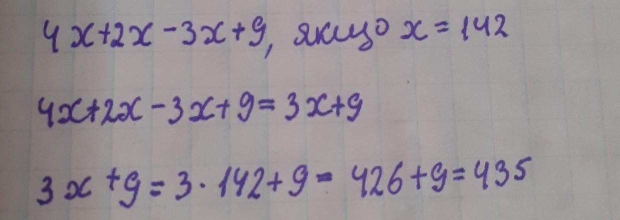 Спрости вираз та обчисли його значення 4х+2х-3х+9 , при х=142. У відповідь запиши отримане число.