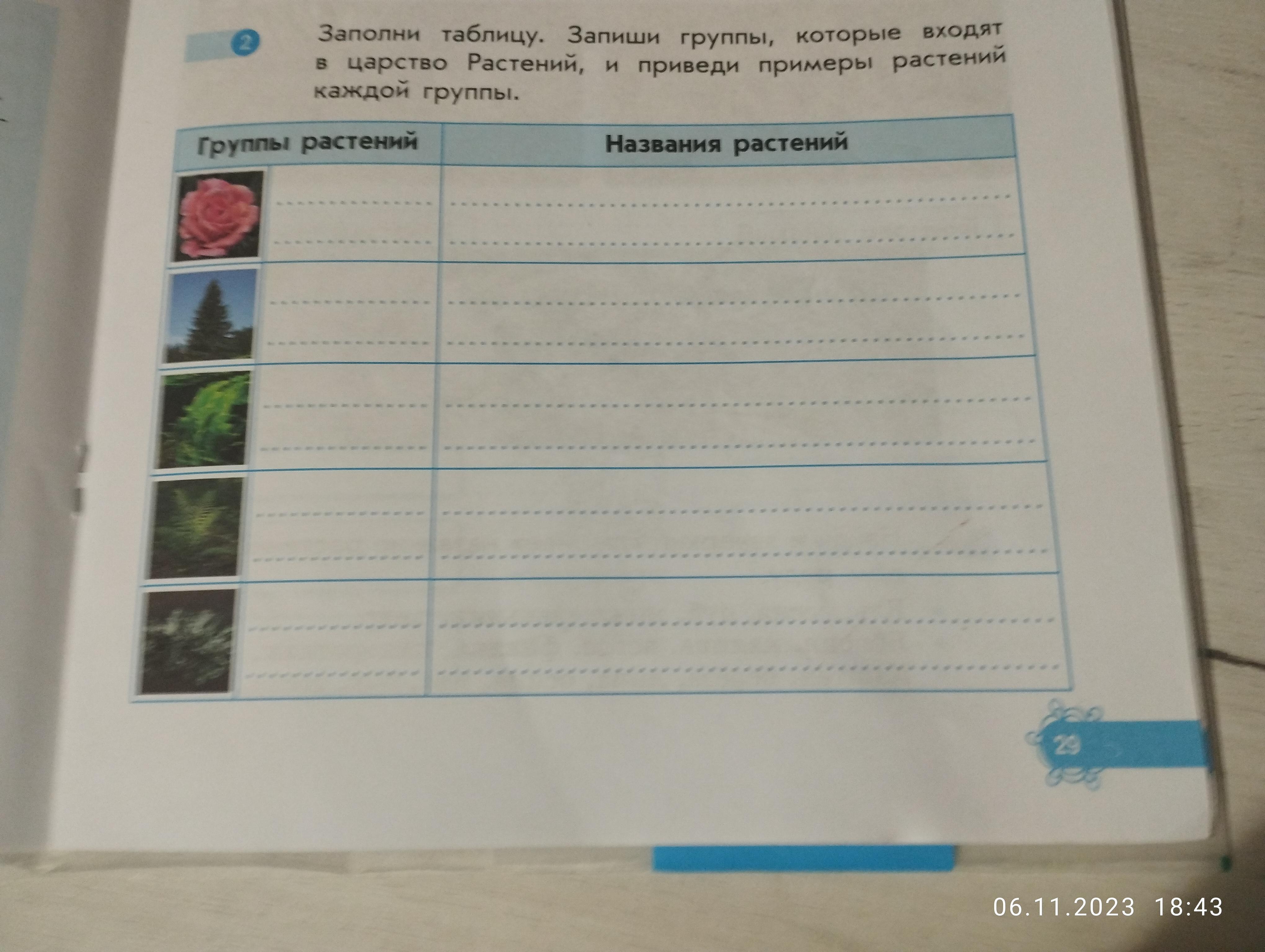Заполни таблицу. Запиши группы, которые входят в царство Растений, и приведи примеры растений каждой группы.