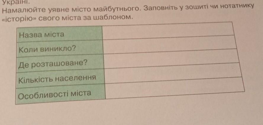 4. Намалюйте уявне місто майбутнього. Заповніть у зошиті чи нотатнику > свого міста за шаблоном. Назва міста Коли виникло? Де розташоване? Кількість населення Особливості міста.
