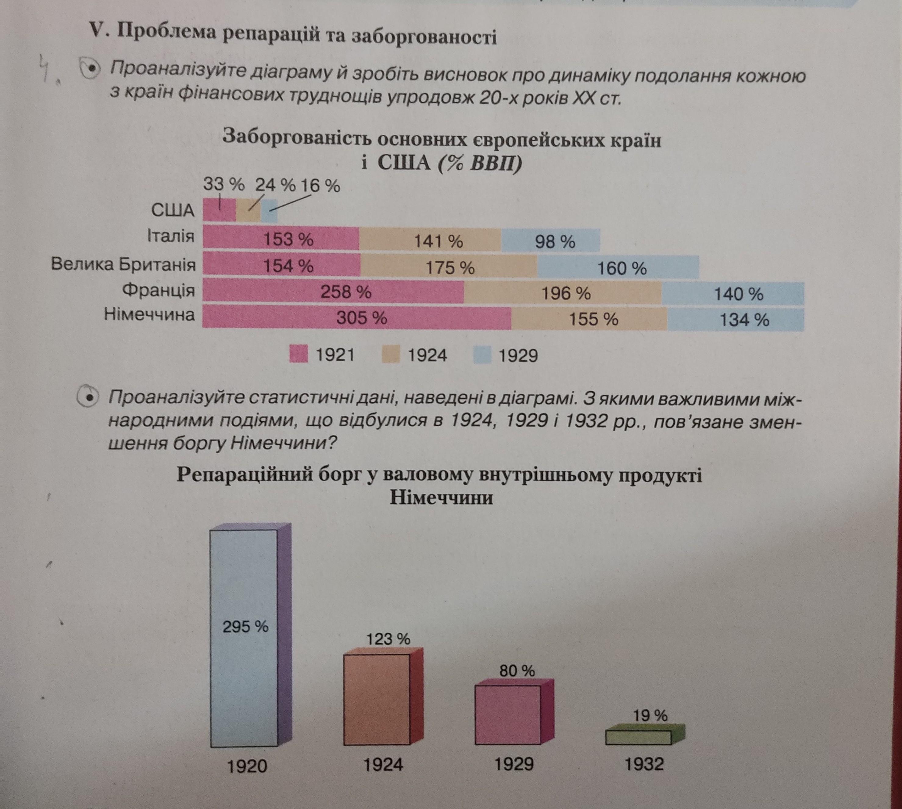 2). 1) У 1924 році було підписано Давський договір, який встановив нові умови щодо сплати репарацій Німеччини після Першої світової війни. Це призвело до зменшення боргу Німеччини.