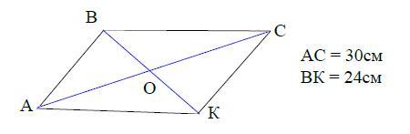 Знайдіть довжину відрізків АО і ВО паралелограма АВСК, якщо його діагоналі дорівнюють 24 дм і 30 дм, а точка О – точка перетину діагоналей